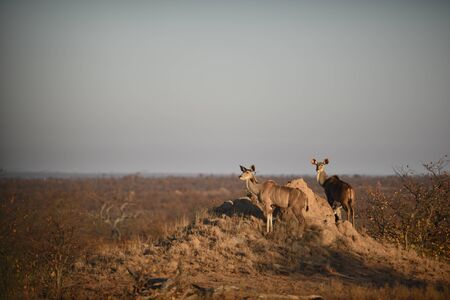 Group of red impala (Aepyceros melampus) standing on the road in the nature reserve at sunset in South Africa