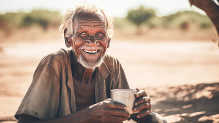 Poor, beggar, hungry smiling elderly old man from Africa, thirsty to drink water. Water shortage on Earth due to global warming, drought, famine. Climate change, crisis environment, water crisis. Saving natural resources, planet suffers