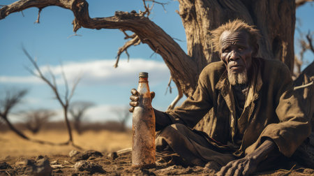 A poor, beggar, hungry old man thirsty to drink from a bottle, in Africa, against the backdrop of dried trees where there is no life. Water shortage on Earth due to global warming, drought, famine. Climate change, crisis environment, water crisis