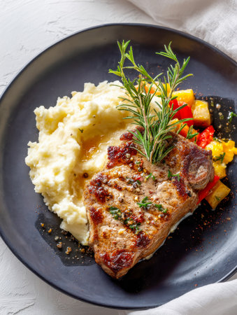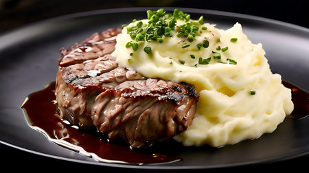 Exquisite grilled steak with velvety mashed potatoes and fresh rosemary in a luxurious setting
