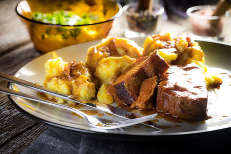 pork Goulash soup Hungarian food with mashed potato and bread on plate