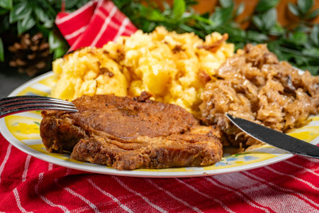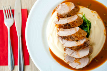 Gourmet pork dish with mashed potatoes, cranberries and gravy sauce, garnished with fresh rosemary and parsley