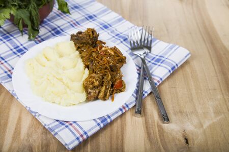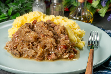 Stewed cabbage with pork, sausages and mushrooms served with mashed potatoes. Bigos - traditional Polish cuisine.
