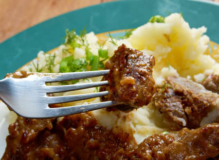 carbonnade de boeuf a la Flamande with mashed potatoes. traditional Belgian sweet-sour beef and onion stew made with beer, and seasoned with thyme, bay and mustard.