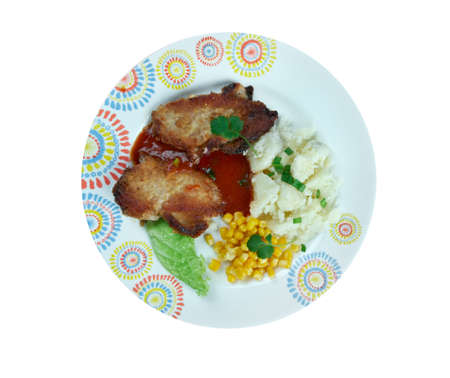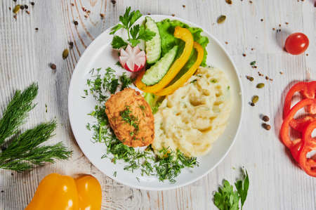 A delicious breakfast or lunch with mashed potatoes, chop with salad - green onions and green young cabbage, parsley on the white plate.