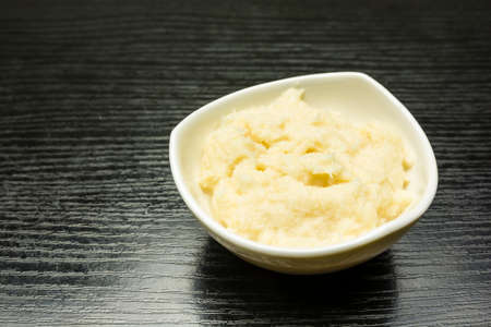 Grated horseradish root in a bowl.