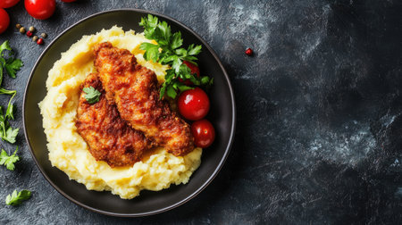 Fried chicken steak or schnitzel with mashed potatoes on black stone table.