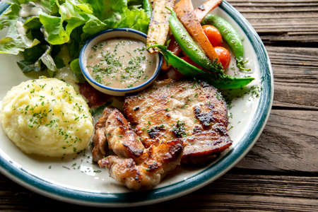 rilled pork steak with Fried vegetables and mashed potatoes close-up on a plate