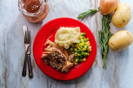 Southern American cuisine slow cooked barbecue pulled pork with creamy mashed potatoes and vegetables