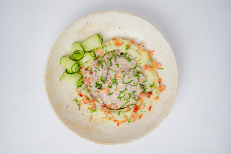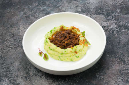 Mashed potatoes with beef, onion and herbs on a white plate