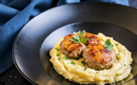 mashed potatoes with meat cutlets on black plate
