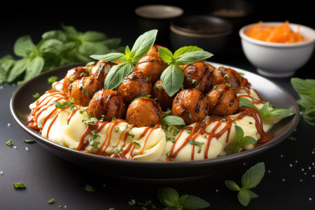 Mashed potatoes with meatballs on a white plate. Restaurant serving. Generated by AI.