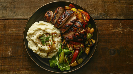 Enjoy a beautifully plated grilled chicken breast accompanied by creamy mashed potatoes and colorful roasted vegetables, ideal for a satisfying dinner experience.