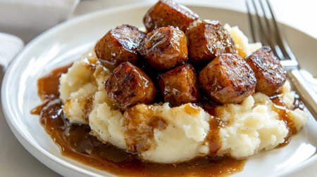 Delicious glazed meatballs with mashed potatoes and rich brown gravy on white plate. Concept of comfort food, homemade dinner, hearty meal, traditional cuisine, rustic serving, classic American dish.