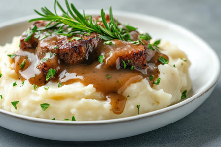 Savory gravy paired mashed potatoes garnished with fresh herbs and tender meaty pieces on a plate.