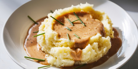 Creamy mashed potatoes topped with savory gravy and fresh chives, served on a white plate