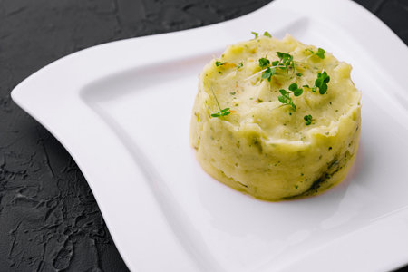 Mashed potatoes in plate on a black background. Restaurant or cafe menu concept.