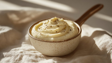 A bowl of creamy mashed potatoes topped with butter and freshly cracked pepper, placed on a soft linen background, perfect for comforting meals.