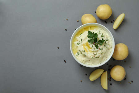 Bowl of mashed potatoes and ingredients on gray background