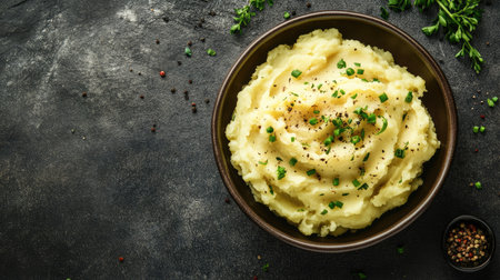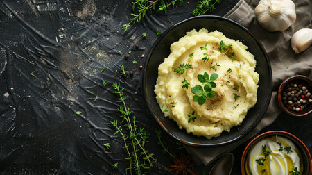 Mashed potatoes with herbs on a dark background. Top view.