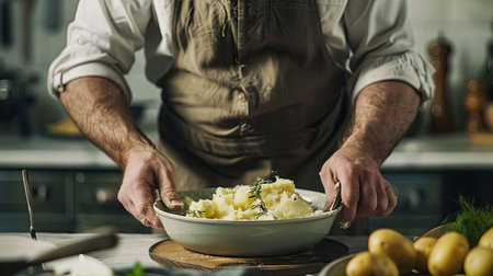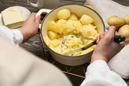 Cropped image of man cooking mashed potatoes in the kitchen at home
