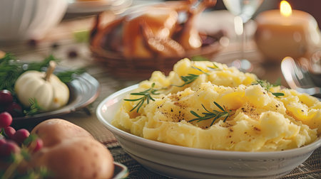 A bowl of creamy mashed potatoes garnished with fresh herbs. Perfect for a cozy dinner or holiday gathering, highlighting delicious comfort food.