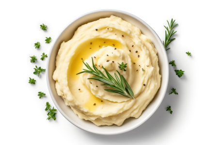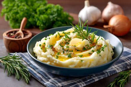 Mashed potatoes with butter, herbs, spices, and rosemary served in a bowl, perfect comfort food for a cozy meal