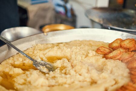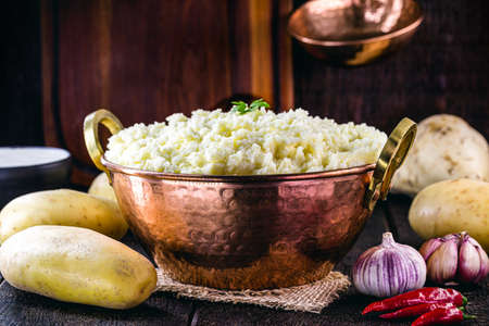 Brazilian potato cream, called mashed potato, served in a rustic copper pot, vegan and healthy food