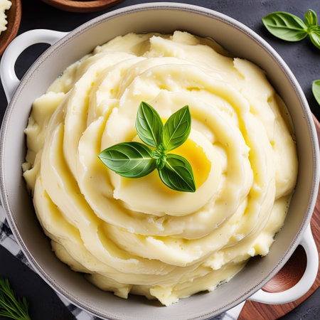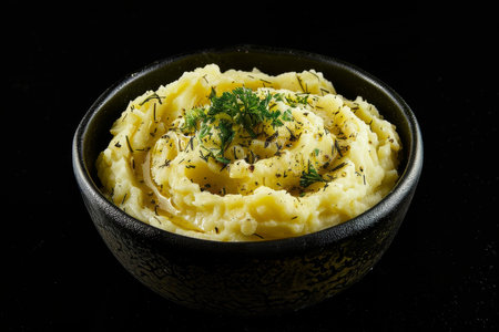 A cozy bowl of creamy mashed potatoes topped with herbs and spices, perfect for enhancing any meal. Ideal for comfort food and culinary inspiration.