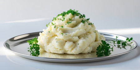 AI Generated. A mound of fluffy mashed potatoes on a polished silver plate surrounded by fresh herbs