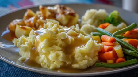 A visually appealing plate showcasing creamy mashed potatoes smothered in rich gravy, surrounded by vibrant mixed vegetables. Ideal for meal inspiration.