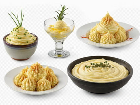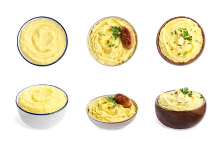 Various mashed potato dishes isolated on white background
