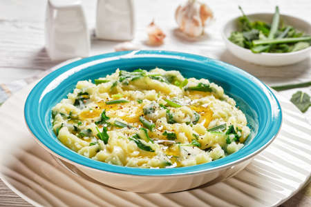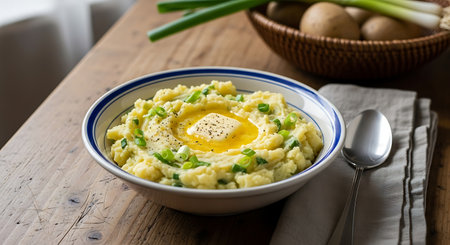 Irish colcannon traditional potato mash with kale, garlic, melted butter and spring onion served on a blue bowl, white counter plate on a white wooden background, top view, close-up