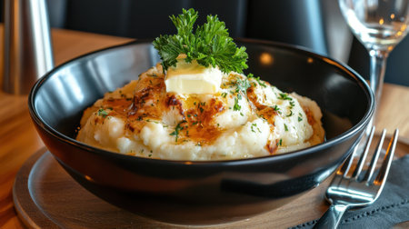 A black bowl of mashed potatoes with butter and parsley on top. The bowl is placed on a wooden table with a fork and a wine glass nearby. Concept of comfort and indulgence