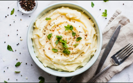 A delicious bowl of creamy mashed potatoes garnished with herbs and seasoning, perfect for comfort food lovers. Ideal for various meals.