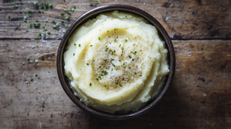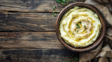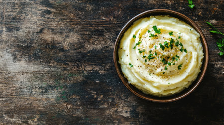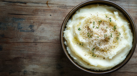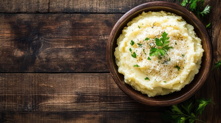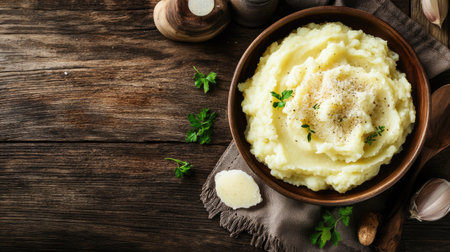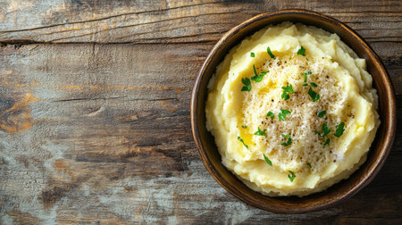 Creamy mashed potatoes with parmesan on a rustic wooden background, photographed from above. The simplicity of the scene leaves ample room for text