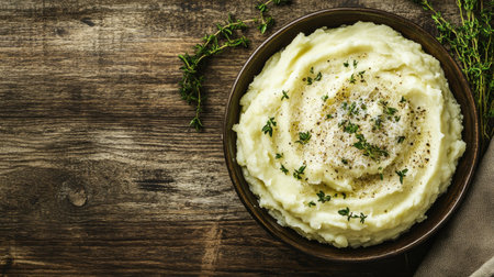 Enjoy creamy mashed potatoes topped with herbs and butter, perfect as a comforting side dish, showcasing rustic elegance on a wooden table.