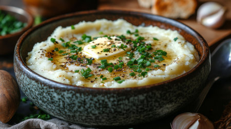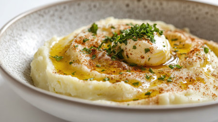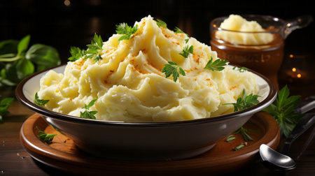 AI Generated. Creamy mashed potatoes topped with spices and olive oil in a rustic bowl