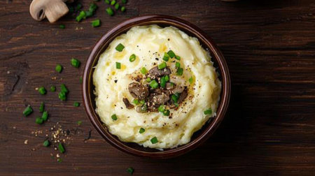 A delightful bowl of creamy mashed potatoes topped with herbs and mushrooms, perfect for comfort food enthusiasts. Ideal for any meal setting.