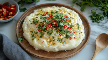 A beautiful presentation of creamy polenta topped with fresh herbs and red chili, showcased on a wooden plate, perfect for a gourmet meal.