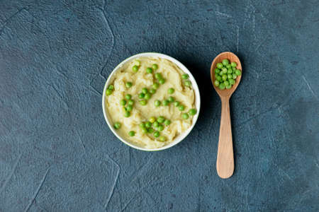 Bowls with mashed potatoes and green peas on table