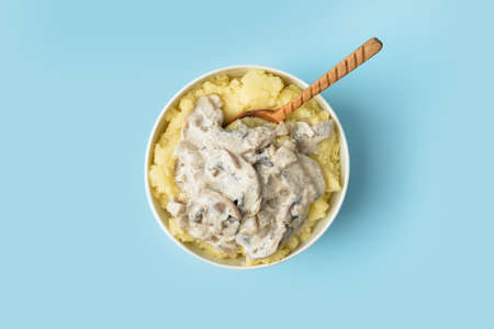 Concept of tasty eating with mashed potatoes on white wooden table