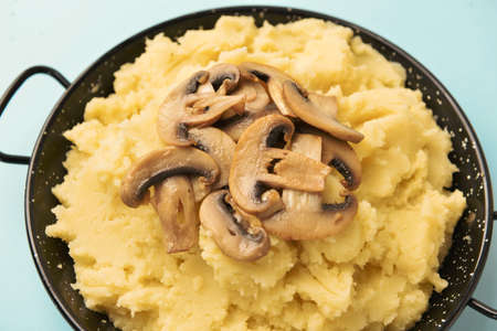 Frying pan with tasty mashed potatoes and mushrooms on color background, closeup