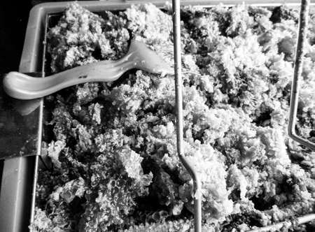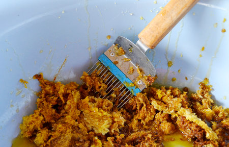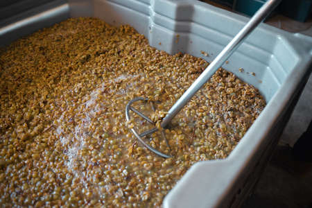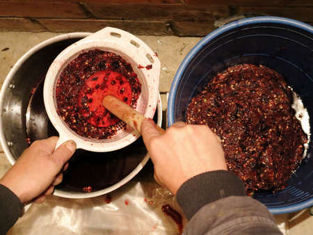 rubbing the grapes through a colander and separating the juice from the cake, manual process of preparing wine material in the course of making homemade wine, filtering fermented wine through a sieve
