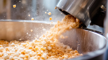An engaging close-up shot of granules pouring into a stainless steel bowl, showcasing the dynamic motion and detailed textures essential for culinary artistry.