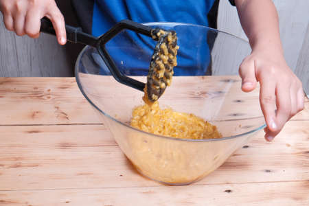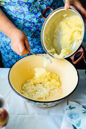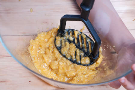 The process of making puree with stainless steel potato masher, close up. Step-by-step recipe for preparing delicious vegetable or vegetarian dishes for cooking blog.
