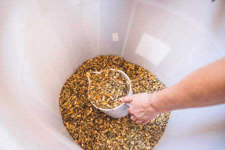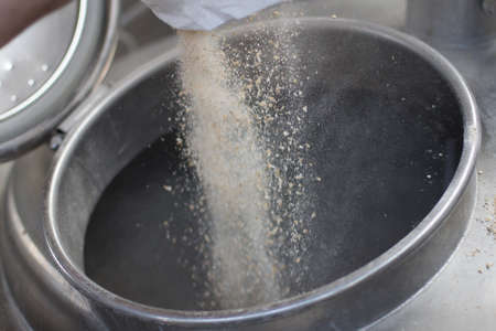 Pouring water into ground barley. Ground barley in a container, grinding barley.