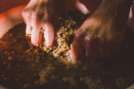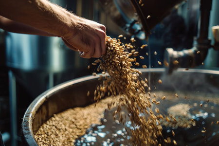 Male hands from which ground malt pours out. good attitude to craft. Craft beer brewing from grain barley pale malt in process.