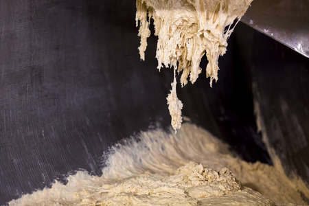 Knead dough at the factory. Machine kneads yeast dough. Kneading dough at the bakery. Workshop of bread factory.
