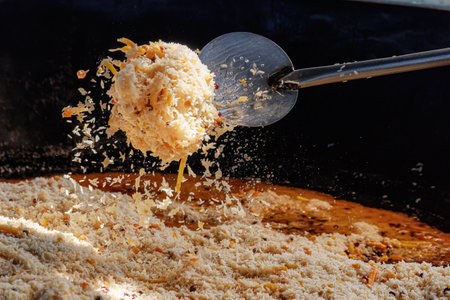 Polenta - corn flour porridge is cooked at a street weekend festival in Alba, Italy.